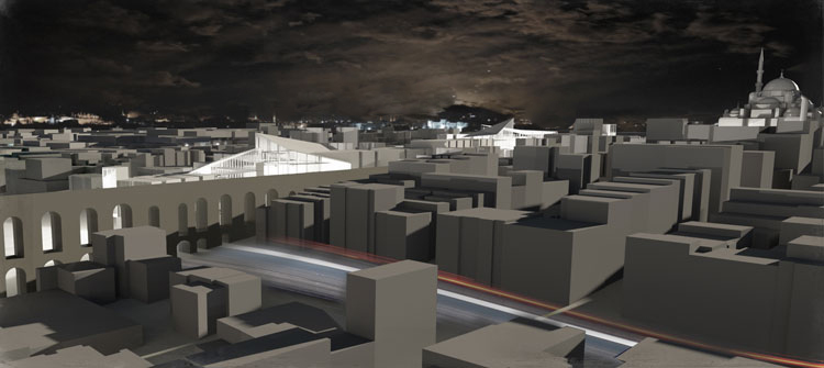 The Istanbul Studio in Fall 2014 focused on the central area of the Historic Peninsula with the historic Valens Aqueduct. The Valens Aqueduct dates back from the Roman and Byzantine periods. The Valens Aqueduct is the remaining portion of the water supply system from the northern lake region to numerous cisterns in the city, ending in the large cisterns at the Hagia Sophia. The Valens Aqueduct spans between the 3rd and 4th hills on which the large Fatih Mosque and the magnificent Suleymaniye Mosque are located. Adjacent to the aqueduct are residential neighborhoods of old buildings and narrow passages on one side, and a large open park space on the other side, surrounded by the Sehzade Mosque, historic Byzantine church ruins and a modern civic building complex.